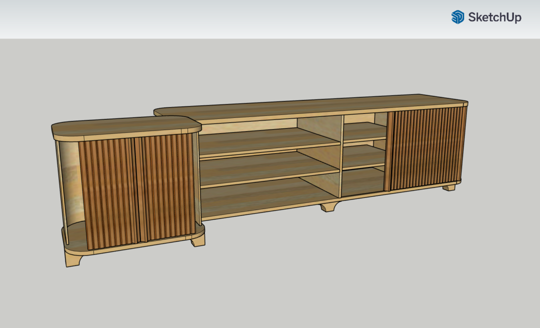 Mijn nieuwste project is een tv-meubel in twee delen. Een deel waar de tv op komt te staan. In het midden komt een wijnrek. Rechts, achter een jalouziedeur komt audioapparatuur. Het linkerdeel is een los ovaal kastje dat precies in de holte van de grote kast past. Dit kan ook op een andere plek gezet kan worden.